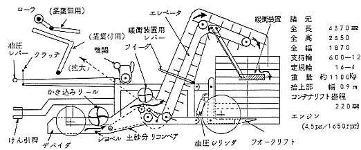 茎葉処理したタマネギの拾上げに際して、茎葉片の混入物を取り除くために引き込みロ−ラを配したが、後方のエレベ−タパッケト先端と地上問隙が小さいので、地上に落とした茎葉片をかき上げるのが認められ、また、降雨などで土が湿ると引き込みロ−ラに茎葉と土砂が絡み付くなどの問題があった。土が乾いた条件では問題はなかった。茎葉付の場合は問題はない。緩衝装置宇亜コンテナリフトの作動は良好と認められた。