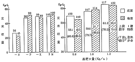 2)基肥N0.8kg以下では成苗水稲よりも稚苗水稲の収量は明らかに劣るが、N1.0Kg以上では成苗水稲との収量差は殆んど認められず、Nの肥効の大きい乾田では、稚苗水稲に対する基肥Nの適量は成苗水稲よりも0.2Kg/a前後多いN1.0Kg/aである。