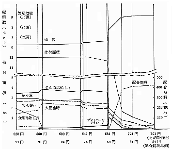畑作部門の収益性が相対的に高い場合、配合飼料は単価が高くても(99〜76円)採用される。また、単価が約64円に下落した場合は、えだ肉価格が700円以上に上昇したと同じ収益性をもたらし配合飼料は大幅に採用される。飼料単価が76〜64円にかけては労働資源、養豚部門の収益性との関連で青刈りとうもろこしサイレージ体系が採用される。