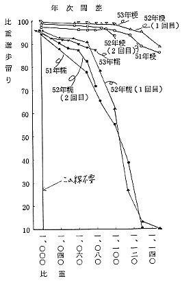 2)年次間差については、生産年の天候(特に登熟期間)により影響され、不良気象条件下の生産種子の歩留りは低く、各比重段階の差も大きくなり、この傾向は粳より比重の軽い糯が顕著であった。