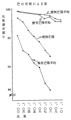 4)芒の有無による歩留りの差は、精選過程で脱芒操作が、行われている範囲で、無芒種は有芒種に比べ歩留りは高い傾向にあるが、粳品種で差は小さいのに対し糯品種では大きい。