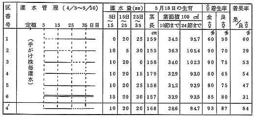 花の着生は差が認められなかったが、開花時も引続き多水分条件とした区で着果率がやや低下した。果実については、後期まで多水分分件(灌水点PF2.0)とした区は肥大が良かったが長型化および果型に乱れが見られた。また、前・後期ともに灌水点PF2.4とした区および5㎜灌水とした区の果の肥大がやや劣った。
