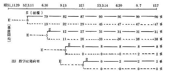 2)12月から3月まで暴露した傷口カからの発病が最も多く、ついで3月から5月まで暴露した傷口が多かった。一方、6月から8月まで、9月から11月まで暴露したものは発病が少なかった。