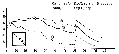 2.鶏ふんと添加物の混合割合は重量比で80:20、もしくは85:15が適当である。添加物は容積重小さく、収容に大きな施設を必要とする。そのため添加割合は少ない方が良いが、その場合は切り返しの頻度を高める必要がある。