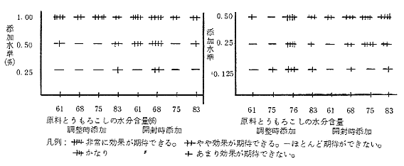 ア、プロピオン酸では100%ギ酸カルシウム複合剤では、0.50%の添加により、全般的に強二次発酵防止効果が認められた。本試験条件では、両添加剤とも開封時添加が調製時添加よりも効果的であり、開封時添加では原料とうもろこしの水分含量が高い場合にはギ酸カルシウム複合剤が、水分含量が低い場合には、プロピオン酸が、より強い二次発酵防止効果を示した。