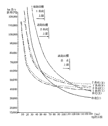 5)3)と4)により収穫機利用の適正規模は全機種補助導入の場合は収穫面積80〜85ha以上で、非補助の場合は110〜120ha以上でそれぞれ自走式ハーベスタが有利となる。