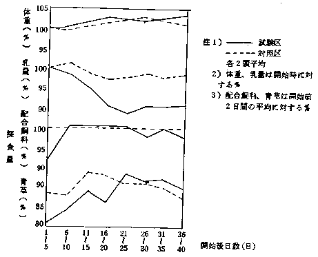 2)試験区は当初、残食を生じ、乳量は減少した。乳質には両区間に差を認めなかった。