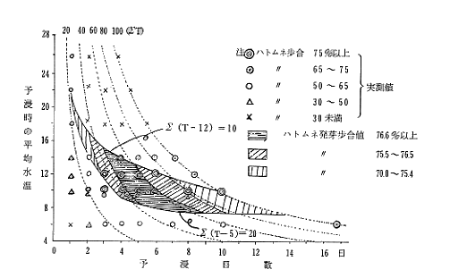図1.予浸日数、予浸時平均水温とハトムネ発芽歩合