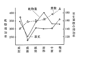 2)中央(図1)では成苗ポット苗が他の育苗様式より、草丈の増加率、分けつ数、発根量において優り、葉数の測定値は優るが増加率はやや小さく、乾物重も大きいが増加率では大差はなかった。