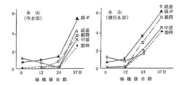 3)上川では移植10日後の枯葉率は成苗ポット苗は殆んど枯葉しないのに対し、成苗は冷水田で51%の高い枯葉率を示した。また乾物増加量および発根量は他の育苗様式より優る。移植後の分けつ発生(図3)は示すとおりで、他の育苗様式より初期分けつの発生が旺盛である。