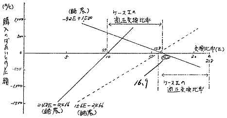 3)交換が成立するのは、双方が上に述べたメリットを受けるとともに、それに伴う費用負担が購入するばあいよりも小さいことが条件となる。費用負担が小さくなるかどうかは交換比率に依存なし、畑作、酪農双方にとって購入するより費用負担が小さくなるような交換比率の範囲を適正交換比率とする。