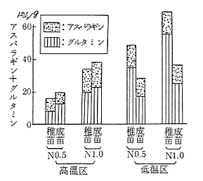 低温処理による体内成分の変化を見ると生育初期のN濃度及び無機成分の体内濃度は稚苗が成苗に比して高く、N成分の中では可溶性成分の遊離アミノ酸、アミドの量が稚苗では多く存在する。低温処理により、特に、アスパラギン、グルタミンの増加が著しく、炭水化物のうち全糖含量が高くなり、一時的貯留物質が増加する。