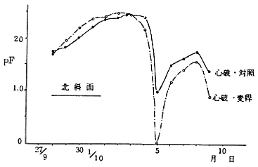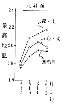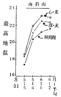 5)両斜面では、地温の推移など接地面の微気象にも大きな特徴がみられ、南斜面は北斜面に比して最高及び最低の地温が高く、且、両斜面の温度較差は最高地温で5℃、最低地温で2℃程度である。又、秋季において麦稈施用区は無施用区に比して地温が1〜2℃低く経過している。しかし、夏季においては心土破砕、深耕処理区の地温が逆に高まる。