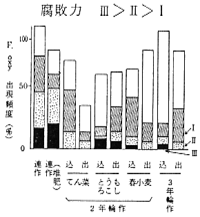 ②輪作の導入は土壌微生物相を豊富にし、土壌およびタマネギ茎盤部でのF.oxyと一般微生物の競合を激しくすると共にタマネギに対する腐敗力の強いF.oxy密度を低下させるために、乾腐病を減少させた。それに対し、堆肥の施用は一般微生物数を増加させず、また糸状菌の類似性指数からも顕著な微生物相の撹乱効果が認められなかった。