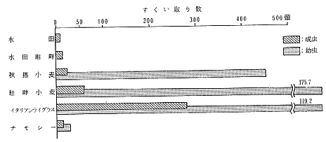 方法:すくい取りによって、カメムシ類の発生量および発生消長を調査