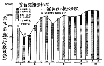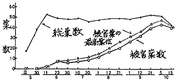 3)線虫の消長と被害の推移:被害葉(黄褐変葉)は6月上旬より増加を続け7月中旬の開花期には約10枚となり10月上・中旬には、ほとんどが被害葉となる。葉内線虫は急増を続け10月には3万頭に達する。5月中・下旬には未展開の生長点付近の密度が高いが、6月上旬から7月中旬には下葉から20葉までがほとんどとなる。8月中旬には40葉以上の上葉にも移行、増殖する。地下の鱗茎内線虫は5月下旬に高まり、地上部の生育につれて葉に移行し減少するが、8月、10月の降雨による葉から遊出のために高まり、鱗茎内に越年し翌年の発生源となる。(図2〜5)