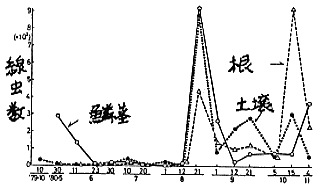 3)線虫の消長と被害の推移:高密度ほ場に「明錦」養成球を前年10月に定植し翌春5月より約10日ごとに調べる。