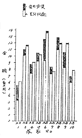 ⑥⑤で試算された作付比を調農家の耕地面積に割りつけた結果、粗収益は54年の作付実績による粗収益よりも高く、雇用労賃差し引いた収益は、よりその差を拡げた。図1参照。この結果、粗収益の低下に或る程度の歯止めをかけると同時に労働費の軽減に結びついた。