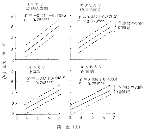 「キタヒカリ」:幼形期 Y=0.467+0.671X 止葉期 Y=0.886+0.488X 但し Y:葉身N% X:葉色 推定精度 ±0.4〜±0.5% 道南は再検討。