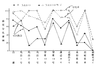 (4)品種間に異った反応が見られたが、多くは培養材料の素質の違いによるものと考えられ、材料の素質を検討することにより、同一手法により、ほとんどの品種の培養が可能であると思われるが、全く目的を達せられなかった品種もあり、品種間にNAAに対する反応の違いがあることも明らかとなった。