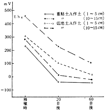 ③土壌動態では、重粘土は移植時からすでにEhが低く20日後でほぼ最低となり、Ehが高く、かつその低下が緩慢な低地土とは異っていた。また地温は、夜間〜早朝に低下しやすい傾向であった。
