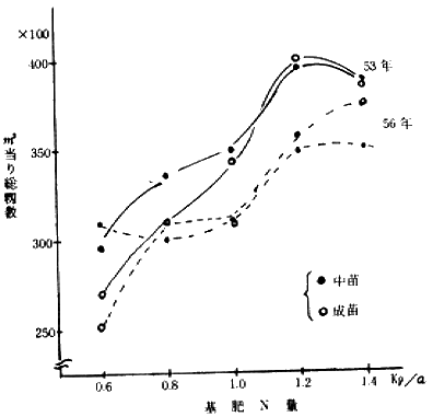 3.基肥N増施による茎数、1穂籾数や総籾数増大などの変動は、成苗より中苗の方が大きい傾向があり不安定性が大きいが、両水稲とも玄米収量はN 1.0Kgでほぼ頭打ちの傾向である。