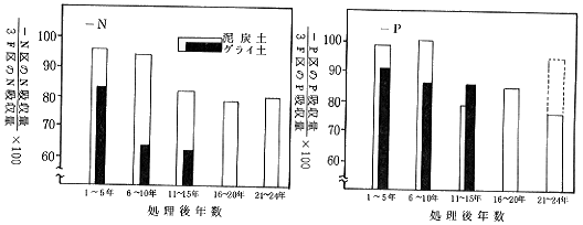 4.珪カルの連用効果は、泥炭土で著しく、9〜13年連用区の玄米重は対照区より13%の増収を示した。グライ土における効果は判然としなかった。