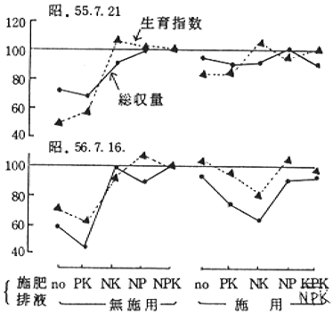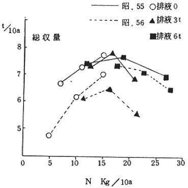 6.排液の施用と土壌条件:高台と低台両条件を比較した結果、高台では3t施用で初期生育が若干遅れたが、その回復は比較的早く、成熟にも差がなかった。また低台では1.5t施用が終、始良好で、いずれも排液施用法として特に問題はなかった。