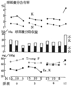 2.排液連用の影響:排液の連用で問題となるK収支をみると、3t連用3年目の球部の吸収量は15㎏(総収量平均6,060㎏/10a)で、排液3t中の量とほぼ等しく、K肥料の節減によって収支相償い、3t以下の施用では土壌蓄積を回避できる。(図2)。