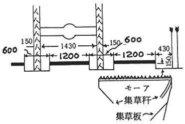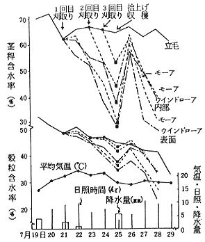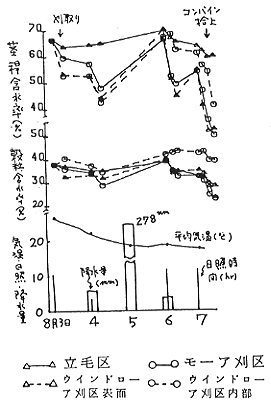 2)刈取法別水分変化(56年):1m×2mの金網上にモーア刈区(厚さ3cm)とウインドローア刈区(12cm)の小麦を置き,地上高15,30cmにした。ビニルシート屋根(3m高)で降雨をしゃ断。刈取翌日及び4日後に降雨量10mm相当分の噴霧区を設定。