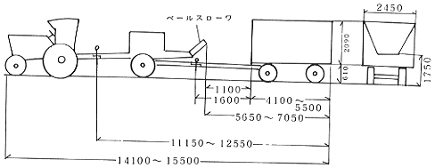 (1)供試機械〔1〕トラクタフォード6600、ヘイベーラNHS69、ベールスローワNH53-A、けん引用ワゴン21.0m3(4.10×2.09×2.45m)、〔Ⅱ〕トラクタインタ434、ヘイベーラNH273、ベールスローワNH53-A、けん引用ワゴン28.2m3(5.50×2.09×2.45m)、ベールスローワ装着時の寸法は図1に示す。
