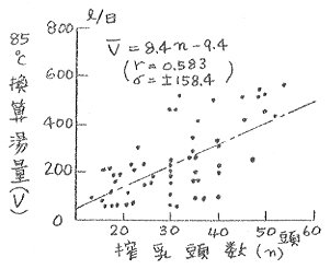 3)現地の牛舎内使用湯の温度・量は用途・搾乳頭数によって異なるが、戸別によっても大きくばらついていた。概略使用湯量は85℃換算では、搾乳頭数をnとすれば、8.4n-9.4(L/日、γ=0.58、σ=158.4)であった。