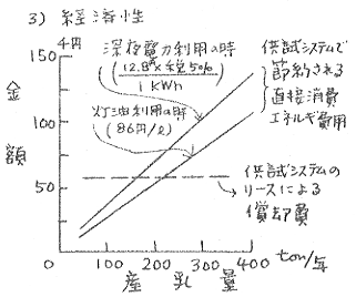 5)試験調査結果及び、リース事業における購入費用を元に、経済性を試算すると、貯乳タンク1500L(隔日用)では、イニシャルコスト44万円、耐用年数8年として現在のエネルギー価格水準(灯油86円/L、深夜電力12.8円/KWh×税5%)においては、灯油湯沸器併用の時、年間〜4万円、深夜電力利用温水器併用の時、年間〜6万円の湯沸し経費節減となる。