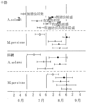 (2)M.persicae−平均的初発期は、十勝で7月6半旬(±1半旬)、斜網では7月6半旬(±1.5半旬)とほとんど同時期であった。最も早い初発は十勝で6月5半旬、斜網で6月2半旬であった。