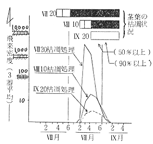 図-2. 枯凋処理時期の異なる畑に設置された黄色水盤への飛来密度(M.persicae)