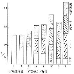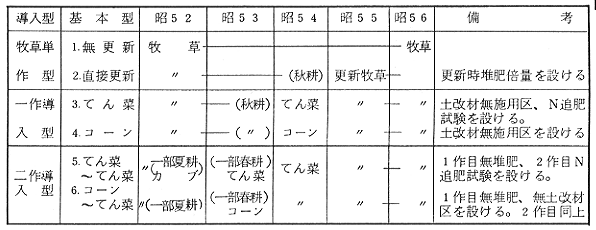 (6)再草地化初年目の牧草乾物収量は二作導入>一作導入>直接更新の傾向を示し、前作間ではてん菜<コーン跡であったが、何れも刈取回数の多い無更新におよぱなかった。 (7)2年目では何れも無更新を上回り、各処理間差は小さくなったが初年目と同傾向であった。このうち、最小収量であった直接更新でも2年間合計で無更新の2年間収量に達した。なお直接更新時に堆肥倍量施用した区の2年合計収量は最も高かった。