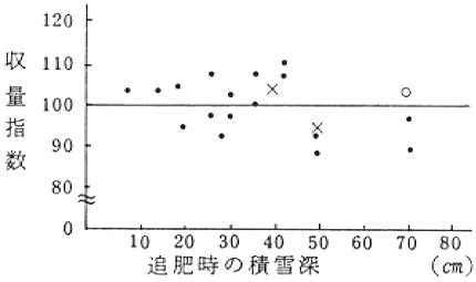 (4)雪上追肥の時期による効果の差をその時の積雪深でみると、試験を行った7〜70㎝の範囲ではとくに相異は認められなかった。また、土壌の種類による効果の差も認められなかった。