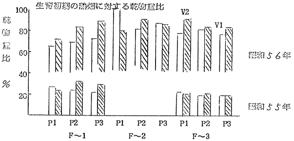 ア:転換畑は熟畑に比較して、発芽まで日数がやや多く、また生育初期の乾物生産量は熟畑の1/5〜4/5程度であった。この発芽の遅れと生育初期の稈乾物生産はその後の生育にも影響し、抽糸期は熟畑に比し10日内外晩く、収穫時の子実の登熟も熟畑に比し一段劣った。