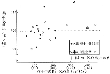 2)カリ欠乏の発生するex-K2Oの下限値は「姫手亡」の場合ex-K2O10mg/100g前後であった。