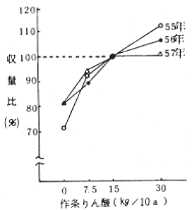 2)作条りん酸の効果を菜根重でみると,トルオーグりん酸50㎎/100g程度以上の土壌りん酸レベルでは明らかでなかったが,それ以下の条件ではりん酸の増施に伴って増収した。