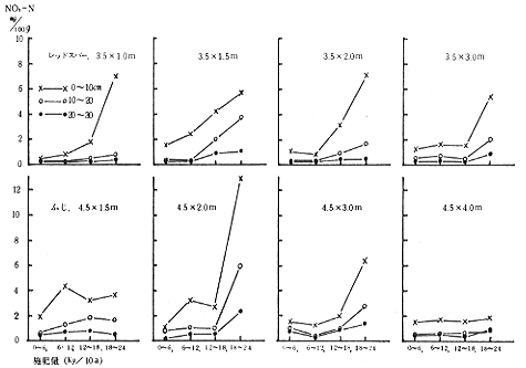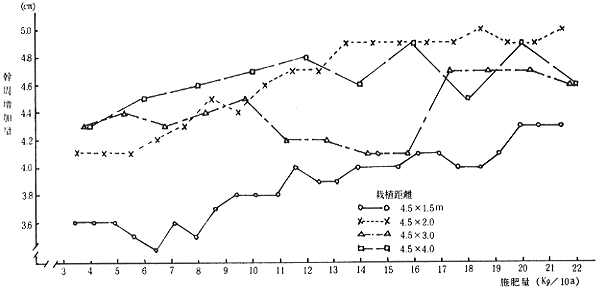 (3)N施肥量;栽植初年目は無肥料,2年目(54年度)は尿素入り複合硝化燐安(15-15-15)を10a当りN成分0〜12Kg,3年目以降は0〜24Kgを4月中旬連続的に施用。