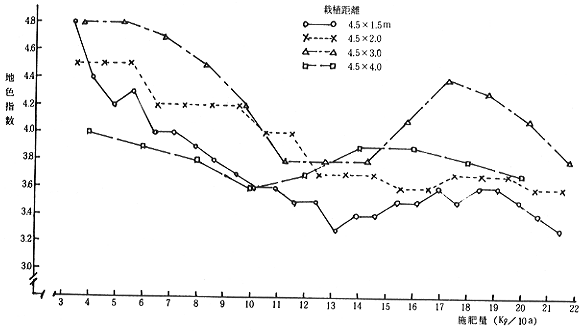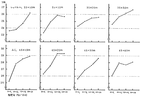 ③従来に比べて栽植本数の多いわい化栽培に於ては,栽植樹数に比例しての増肥の必要はなく,現在の施肥標準における単位面積当りの施肥量で対応できる。
