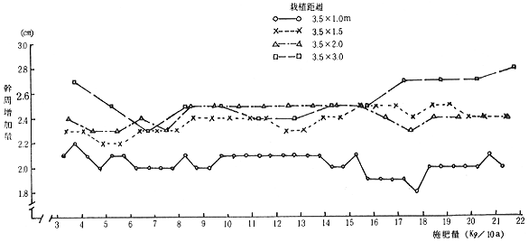 ②樹体生育は,栽植密度の最も高い(3.5×1.0m)区は,他区に比べて幹周増加量が小さいなど,施肥段階にかかわりなく生育が劣った。しかし,施肥量の影響は栽植密度にかかわりなく,ほとんど認められなかった。