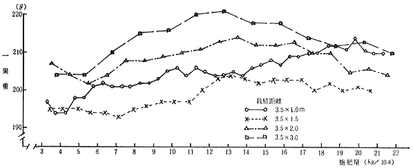1果重は,栽植密度の高い区で小さく,施肥量の影響は高密植区では,施肥量増に伴って大きくなる傾向にあったが,栽植密度が低くなると,10〜15Kg程度の施肥範囲で優る傾向があった。