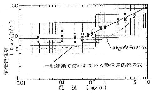 図3 ベクトル放射温度計の熱伝達係数と風速の関係