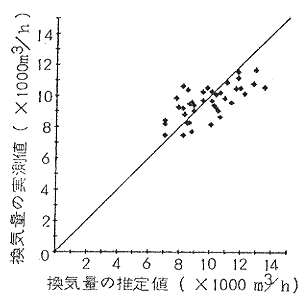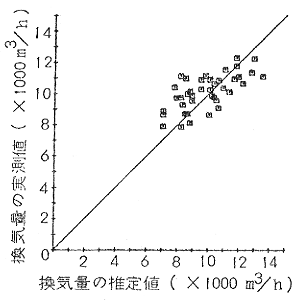 :ViとV0の平均値の二種類がある。両者で求めた換気量はほぼ近似した値となる。図1.図2に2)、3)式で求めた換気量と実測値の比較した例を示す。牛の水蒸気の発生量は図3より求めた値と牛舎内の牛の総体重から求めた。絶対湿度と比較積は、湿り空気線図(図4)から求められる。