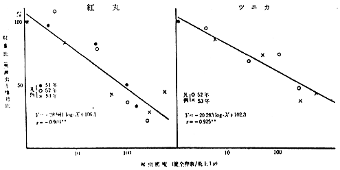 収量は抵抗性品種、感受性品種ともに、線虫密度に応じて減収するが、その程度は「紅丸」に比して「ツニカ」はやや軽い傾向である(第1図)。すなわち線虫密度が乾土1g当り10卵では両品種とも20%、100卵では「紅丸」が約60%、「ツニカ」約40%の減収となる。植付時線虫密度と増殖率の関係は、「紅丸」では植付時の線虫密度が低いほど増殖率は高まるが、「ツニカ」では植付時の密度に関係なく、植付時の30〜10%以下となった(第2図)。