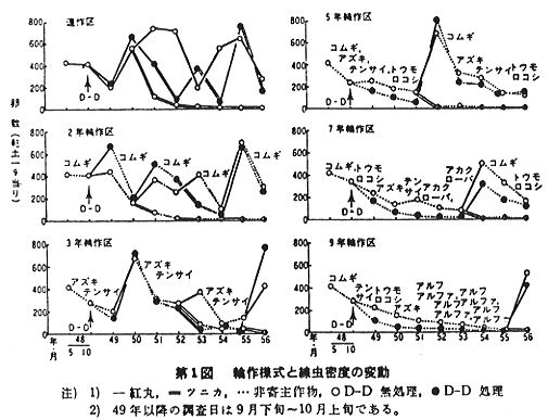 (1)連輪作と線虫密度の変動および作物の生育収量