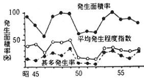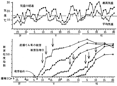 なると、成虫の飛来量が多く、節食量が増すので初期の被害が大きくなる。