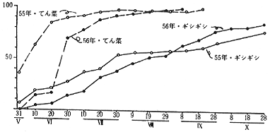 | 昭54年の平均(月、半旬) | 7.4 | 8.2-5 | 9.4 | 平 均 | 43 | 48 | 56 | |||